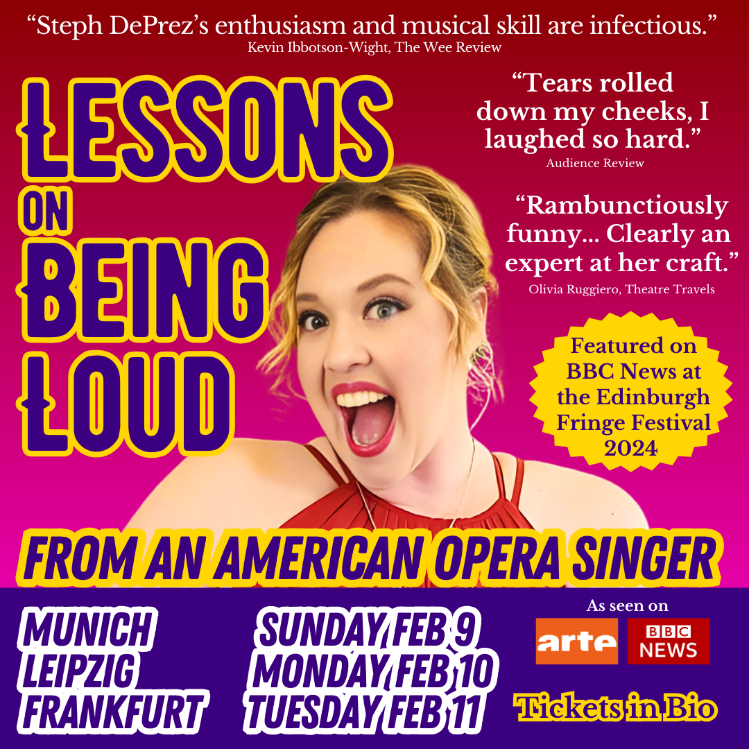 Every time I take this beauty out for a promanade on the stage, I learn something new. I premiered Lessons on Being Loud at EdFringe 2024, and I most recently did a house show for close friends and family in Denver over the holidays. Did you miss the show’s Berlin premiere last October? You’re in luck! I’m doing it again at Wein Salon in March!!